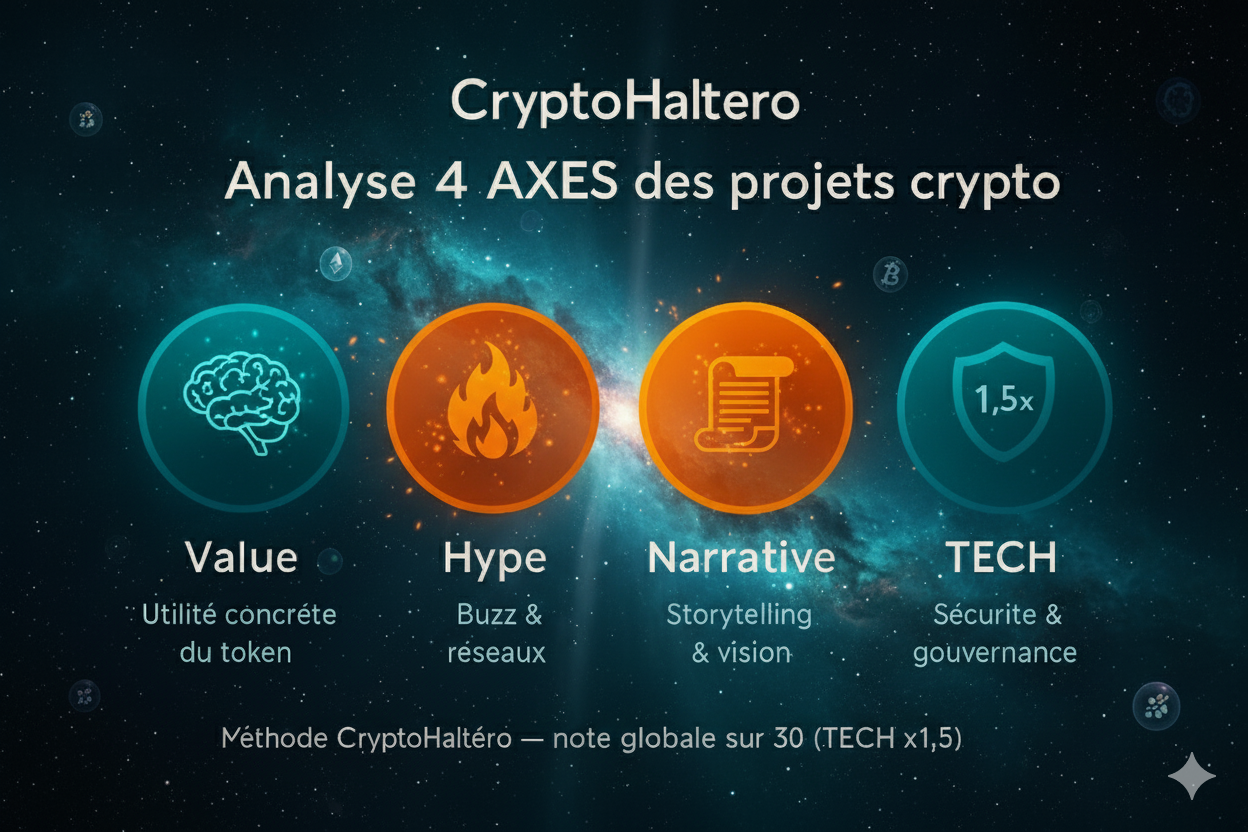 Dans la jungle des cryptos, beaucoup brillent... mais peu captent réellement la valeur. L’approche CryptoHaltéro analyse chaque projet selon **4 AXES essentiels** pour t’aider à distinguer les véritables potentiels des feux de paille :