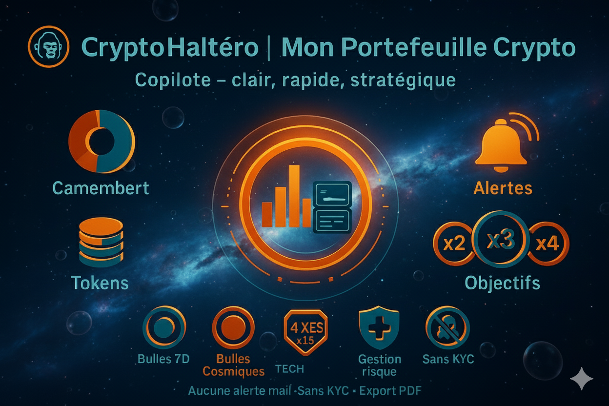 Bienvenue dans ton Copilote Crypto : un tableau de bord pensé pour alléger ta charge mentale et t’accompagner dans la jungle des marchés. Ici, pas de casse-tête : tu indiques simplement ton montant global investi et les quantités de cryptos que tu possèdes.